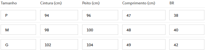 (Medidas Modelo: Busto: 84cm | Cintura: 60cm | Quadril: 96cm | Altura: 1,60cm)