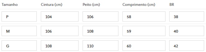 (Medidas Modelo: Busto: 84cm | Cintura: 60cm | Quadril: 96cm | Altura: 1,60cm)