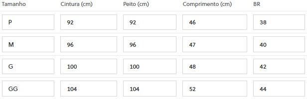 (Medidas Modelo: Busto: 84cm | Cintura: 60cm | Quadril: 96cm | Altura: 1,60cm)
